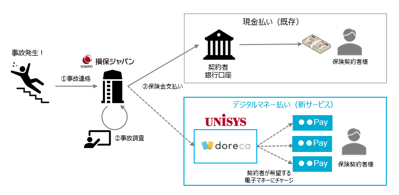 損保ジャパンおよび日本ユニシスは、電子マネーに対するお客さまニーズの高まりを踏まえ、日本ユニシスが提供する価値交換基盤「doreca」(※)を利用した電子マネーによる保険金支払サービスを提供します。
