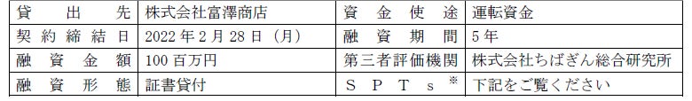 千葉銀行(頭取 米本 努)は、2022年2月28日(月)、株式会社富澤商店(代表取締役社長富澤 洋、本社:千葉市花見川区)に対して、今年1月より取扱いを開始した「ちばぎんSDGsリーダーズローン(サステナビリティ・リンク・ローン型)」を取り組みました。