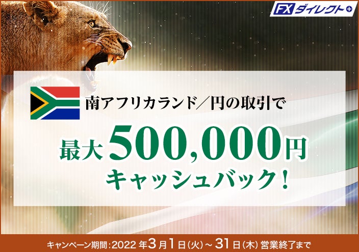 キャンペーンに申し込まれたお客さまに、期間中におけるFXダイレクトプラスでの南アフリカランド/円の新規取引合計数量に応じて、最大500,000円をキャッシュバックします。