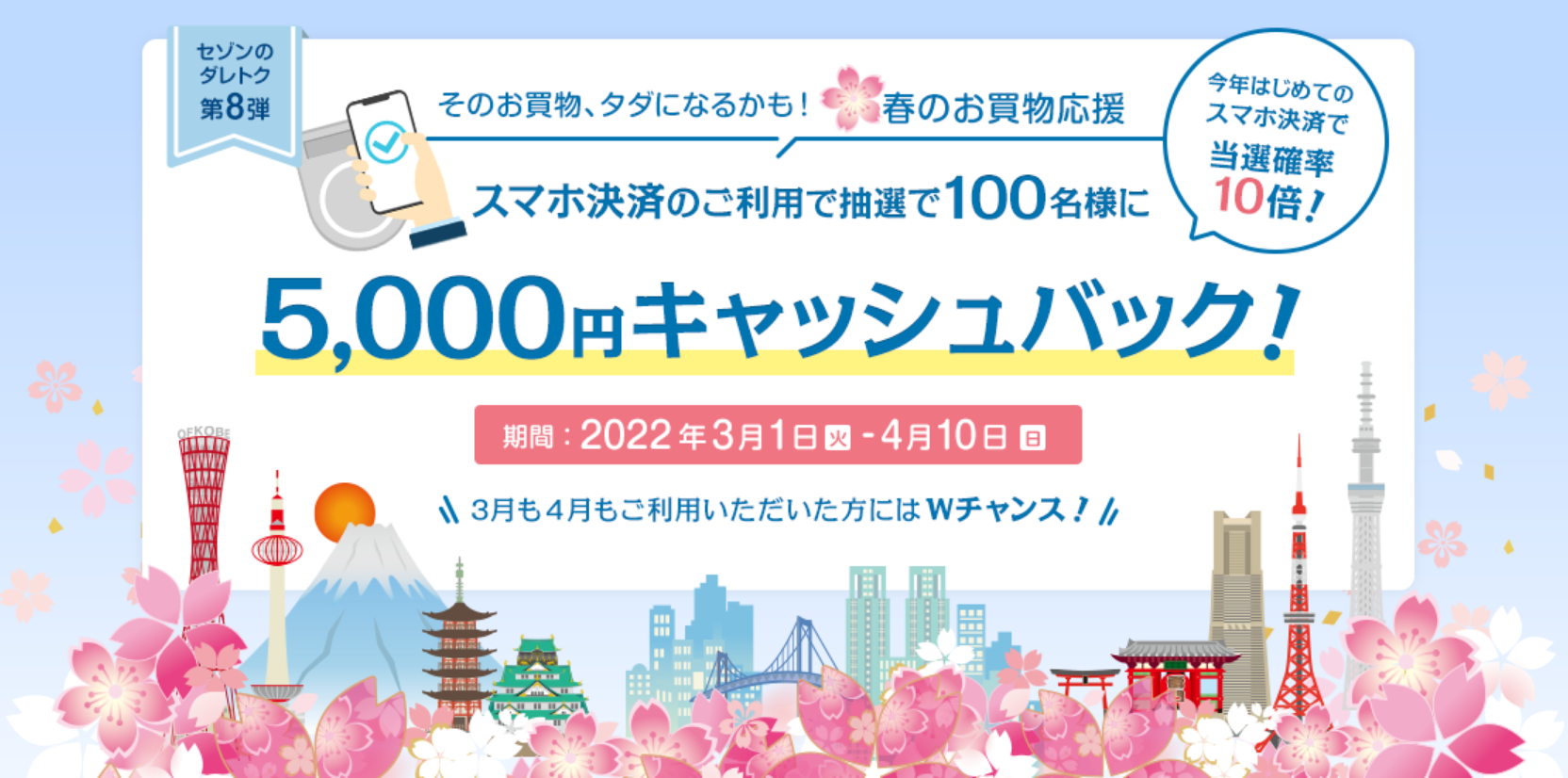 株式会社クレディセゾン(本社:東京都豊島区、代表取締役(兼)社長執行役員COO:水野 克己)は、ユーザーの皆様がセゾンカード・UCカードを使いながら楽しんでいただける企画を発信する「セゾンのダレトク」の第8弾として、クレディセゾン発行のセゾンカード・UCカードを登録した、キャンペーン対象のスマホ決済をご利用いただくと、抽選で100名様に5,000円キャッシュバックされるキャンペーンを2022年3月1日(火)から4月10日(日)まで開催いたします。