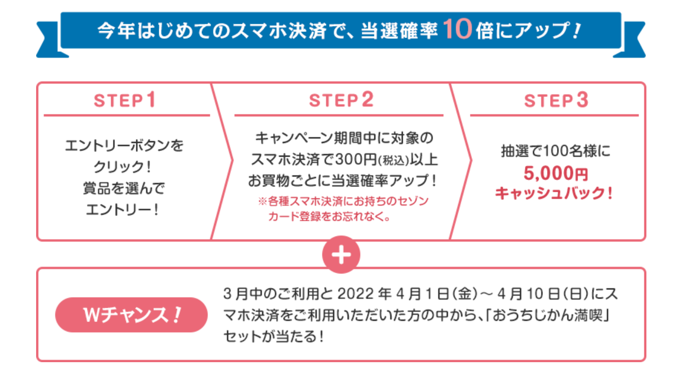 さらに、キャンペーン期間中の3月、4月両月でスマホ決済をご利用いただいた方にはWチャンスとして、日本を旅する「おうちじかん満喫セット」が当たります。