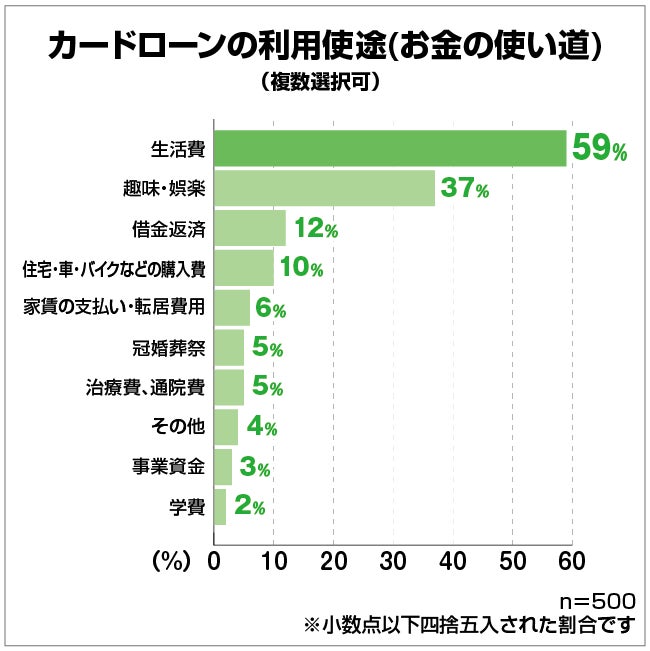 借りたお金の使い道は生活費が最も多く59%で、趣味や娯楽に利用している人も多く見られました。