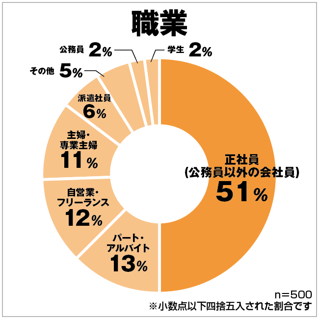 雇用形態は正社員(公務員以外の会社員)が約半数で最多、次いでパート・アルバイト、自営業・フリーラかンスなど。