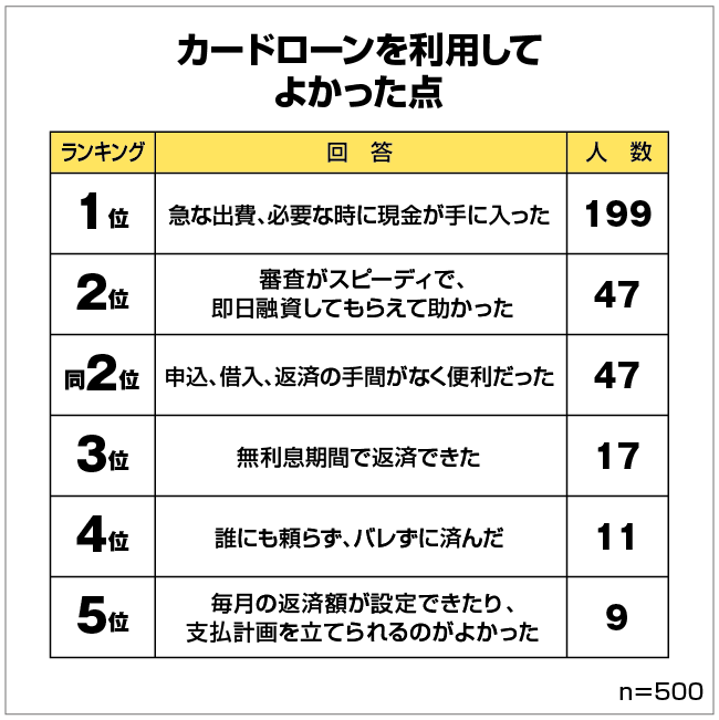 カードローンを利用した感想を記述式で回答募集したところ、様々な「助かった」の声が届きました。中でも「今日中にお金が必要なときに本当に助かった」「どうしても諦めきれなかった商品が購入できた」というものが多くありました。