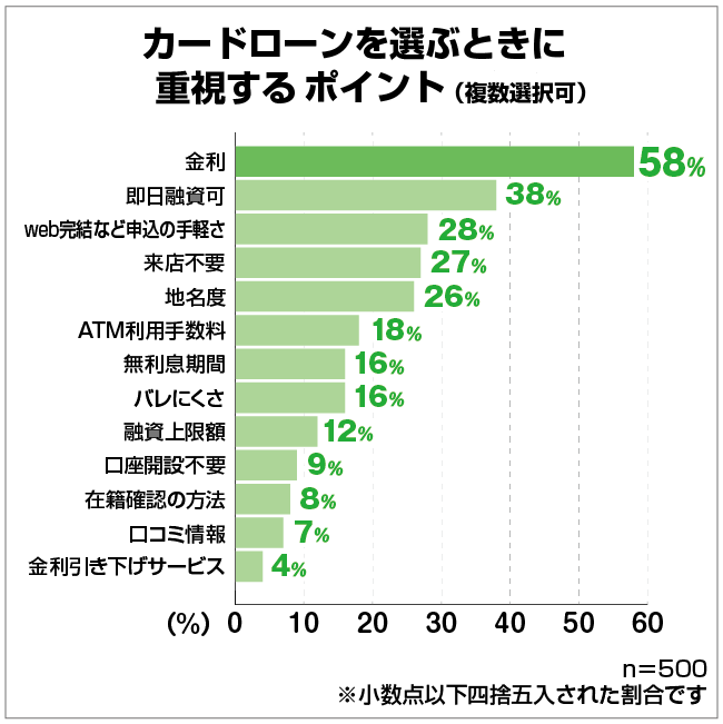カードローンを選ぶときに重視するポイントとしてもっとも回答数が多かったのは「金利」、続いて「即日融資ができるか」でした。やはり金利で比較して検討する人が多いようです。