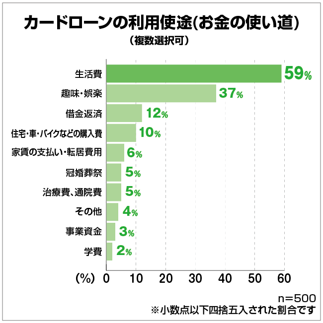 借りたお金の使い道は生活費が最も多く59%で、趣味や娯楽に利用している人も多く見られました。