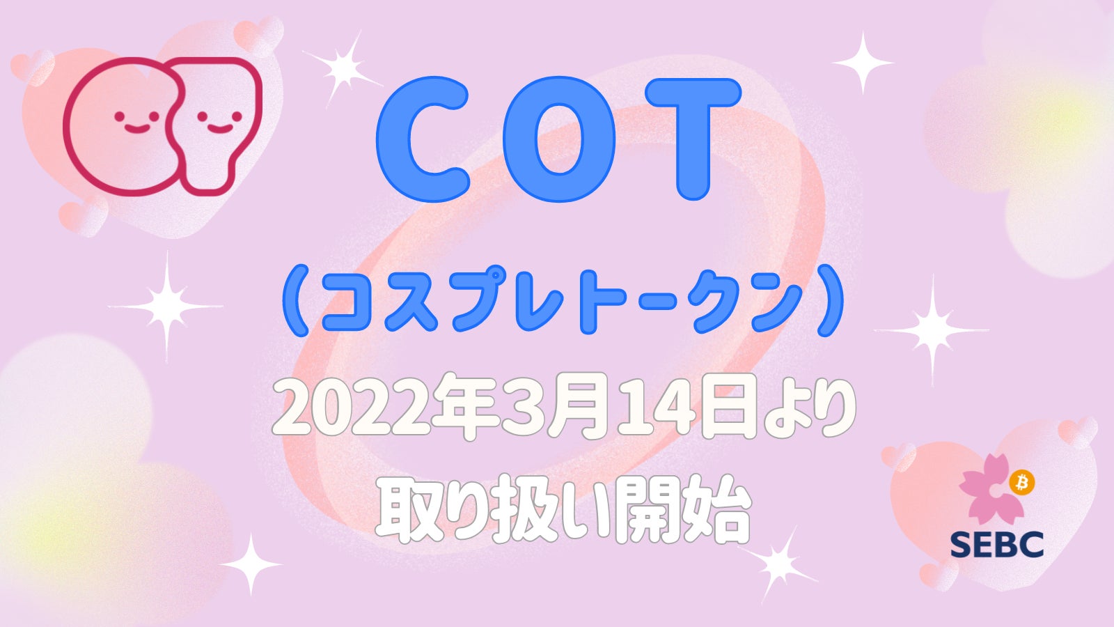 株式会社サクラエクスチェンジビットコイン(近畿財務局長第00003号、以下、SEBC、本社:大阪府大阪市、代表取締役:山本仁実)は、3月14日(月)より国内初となるCOT(コスプレトークン)の取り扱いを開始する予定であることをお知らせいたします。