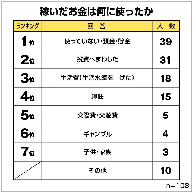 稼いだお金の使い道は、1位が「使っていない・預金・貯金」という結果に。投資で稼いでいた方は、多くが「投資へまわした」という回答になっていました。