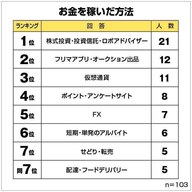 保険相談サービスを提供する保険マンモス株式会社はこの度、男女103人を対象に「お金を稼いだ方法に関するアンケート調査」を実施いたしました。