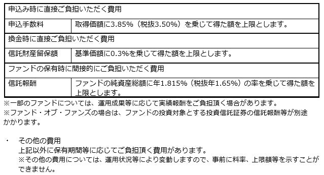 上記のリスクや費用項目につきましては、一般的な投資信託を想定しております。費用の料率につきましては、当社が運用する公募投資信託のうち、徴収する夫々の費用における最高の料率を記載しております。手数料の合計額については、投資家の皆様がファンドを保有される期間などに応じて異なりますので、表示することができません。投資信託に係るリスクや費用は、夫々の投資信託により異なりますので、ご投資をされる際には、事前によく目論見書や契約締結前交付書面をご覧下さい。