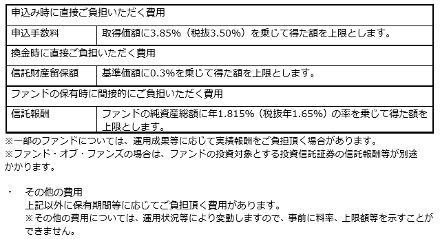 上記のリスクや費用項目につきましては、一般的な投資信託を想定しております。費用の料率につきましては、当社が運用する公募投資信託のうち、徴収する夫々の費用における最高の料率を記載しております。手数料の合計額については、投資家の皆様がファンドを保有される期間などに応じて異なりますので、表示することができません。投資信託に係るリスクや費用は、夫々の投資信託により異なりますので、ご投資をされる際には、事前によく目論見書や契約締結前交付書面をご覧下さい。