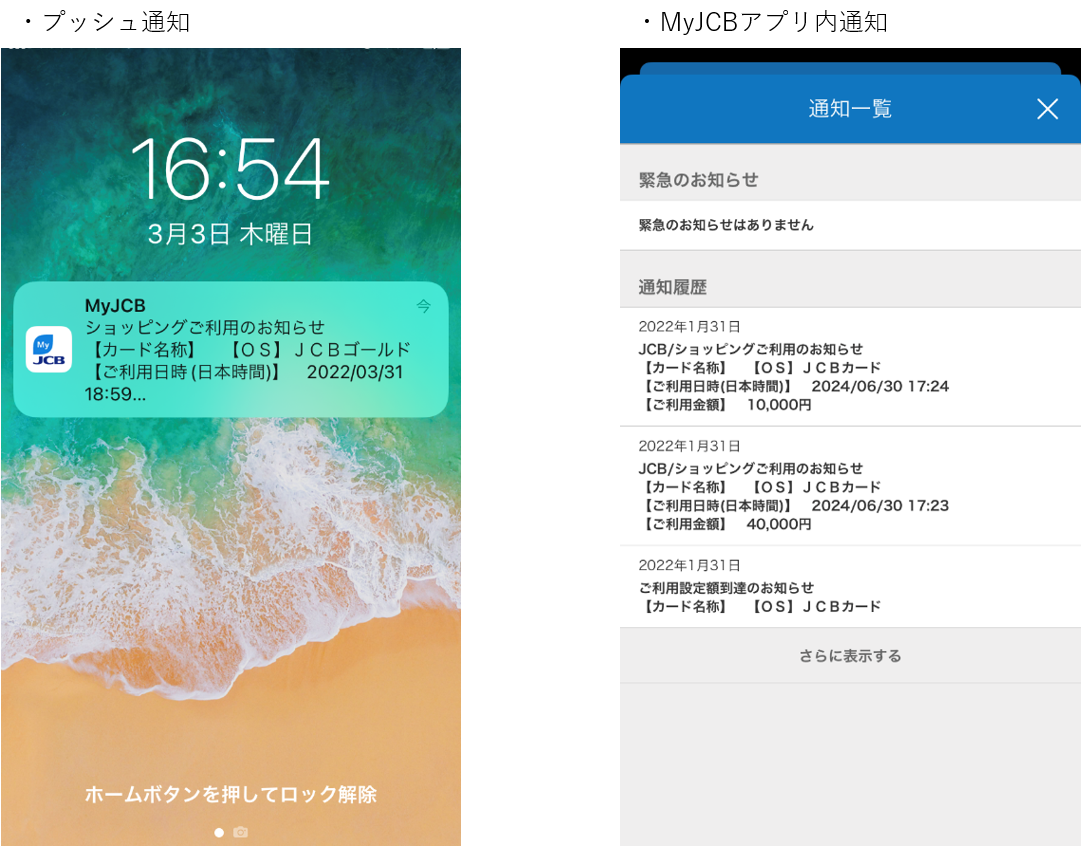 ※①ご利用通知、②使いすぎアラートのいずれも上記イメージの通り、プッシュ通知およびMyJCB内での通知となります。