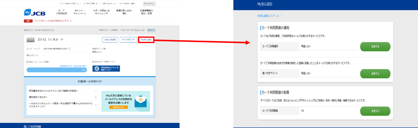 MyJCBトップ「My安心設定」を選択し、ご利用のメニューを選択してください。