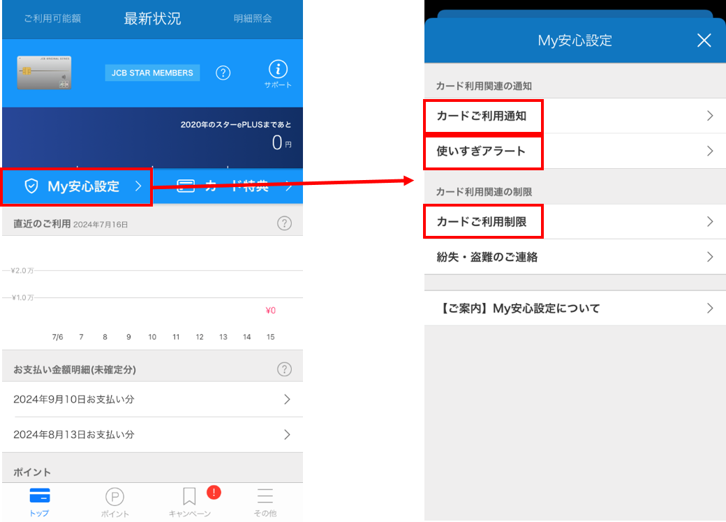 MyJCBトップの「My安心設定」をタップし、ご利用のメニューを選択してください。