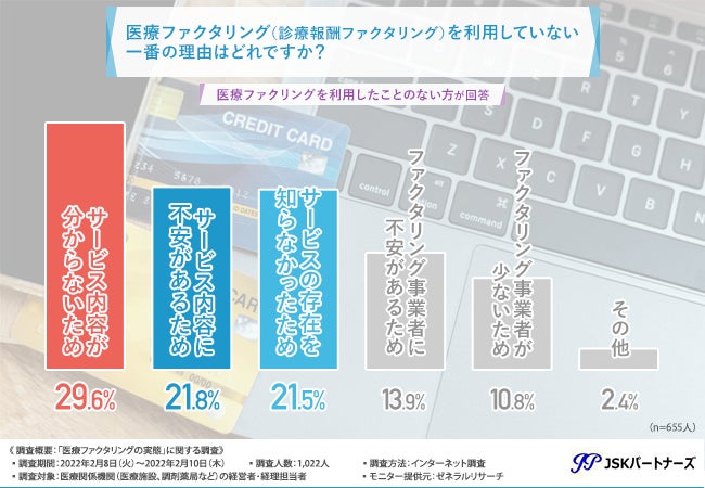 先程の質問で『いいえ』と回答した方に、「医療ファクタリング(診療報酬ファクタリング)を利用していない一番の理由はどれですか?」と質問したところ、『サービス内容が分からないため(29.6%)』と回答した方が最も多く、次いで『サービス内容に不安があるため(21.8%)』『サービスの存在を知らなかったため(21.5%)』『ファクタリング事業者に不安があるため(13.9%)』『ファクタリング事業者が少ないため(10.8%)』と続きました。