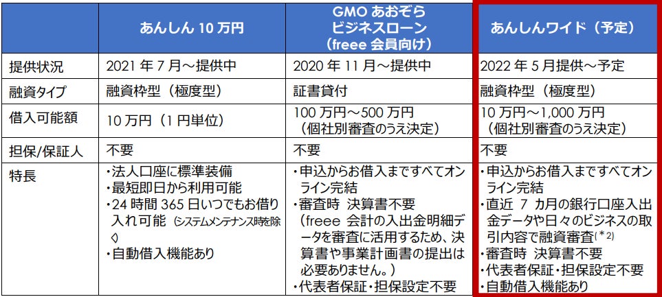 「あんしんワイド」も、これまでのビジネスローンと同様、銀行口座の入出金データ(直近7カ月分)をもとに融資審査を行うため、審査にあたって決算書や事業計画書を提出いただく必要がなく、オンラインでお申し込みいただける、利便性の高い商品となる予定です。(*1)。