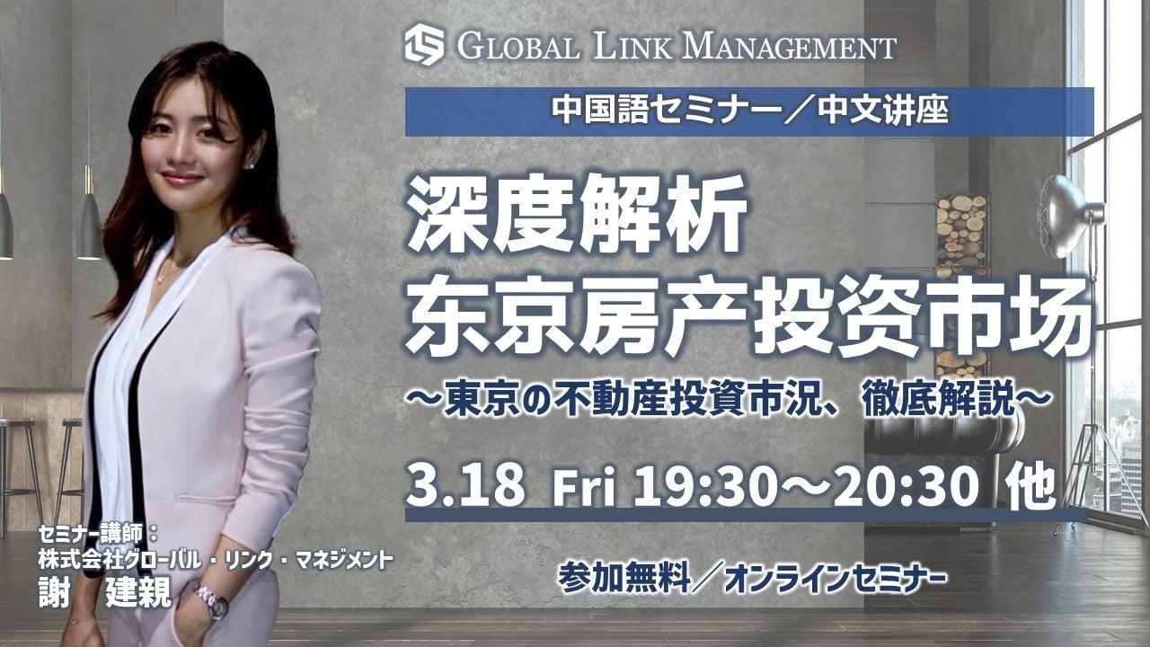 投資用不動産を扱う株式会社グローバル・リンク・マネジメント(本社:渋谷区、以下「GLM」)は、中国語でのセミナー「東京の不動産投資市況、徹底解説」をオンライン形式で複数回開催いたします。