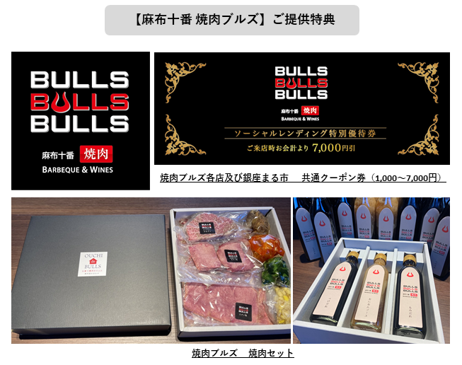 「COOL」を通じて一定金額以上の投資をされた方を対象に、株式会社シティダイニング(http://www.city-dining.jp/)が運営する「焼肉ブルズ」(http://www.yakiniku-bulls.jp/)や、すっぽん・ふかひれ料理「銀座まる市」(http://maruichi-ginza.com/)に加え、今年1月にオープンした「BAR ROMANO」のクーポン券やお食事セットの特典がございます。