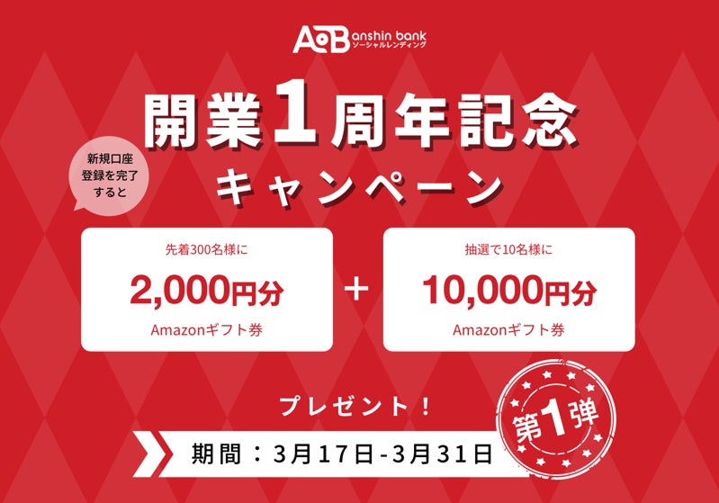 開業1周年記念キャンペーン第1弾は、新規に口座開設を完了いただいたお客様先着300名様にAmazonギフト券2,000円分プレゼント。さらに、第1弾のキャンペーン期間中に新規に口座開設を完了いただいたお客様の中から抽選で10名様にAmazonギフト券10,000円分プレゼント!