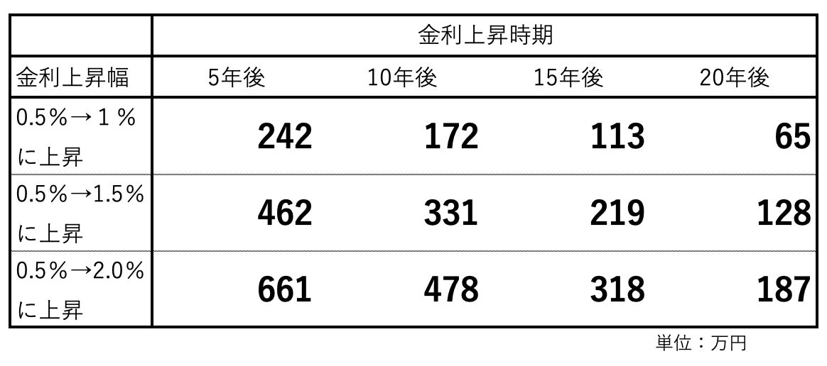 もし5年後に金利が0.5%→1%になった場合、242万円を繰上返済すれば毎月返済額は金利上昇前と同じにできます。どのシナリオを前提とするかによりますが、200〜300万円ほどあれば毎月返済額の上昇を抑えることができそうです。