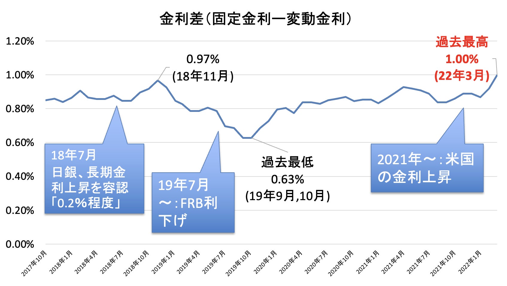 アメリカの利上げを受けて、日本の住宅ローンの固定金利が上昇しています。一方で、変動金利は低いまま推移しているため、固定金利と変動金利の金利差は過去最大の1%となりました。