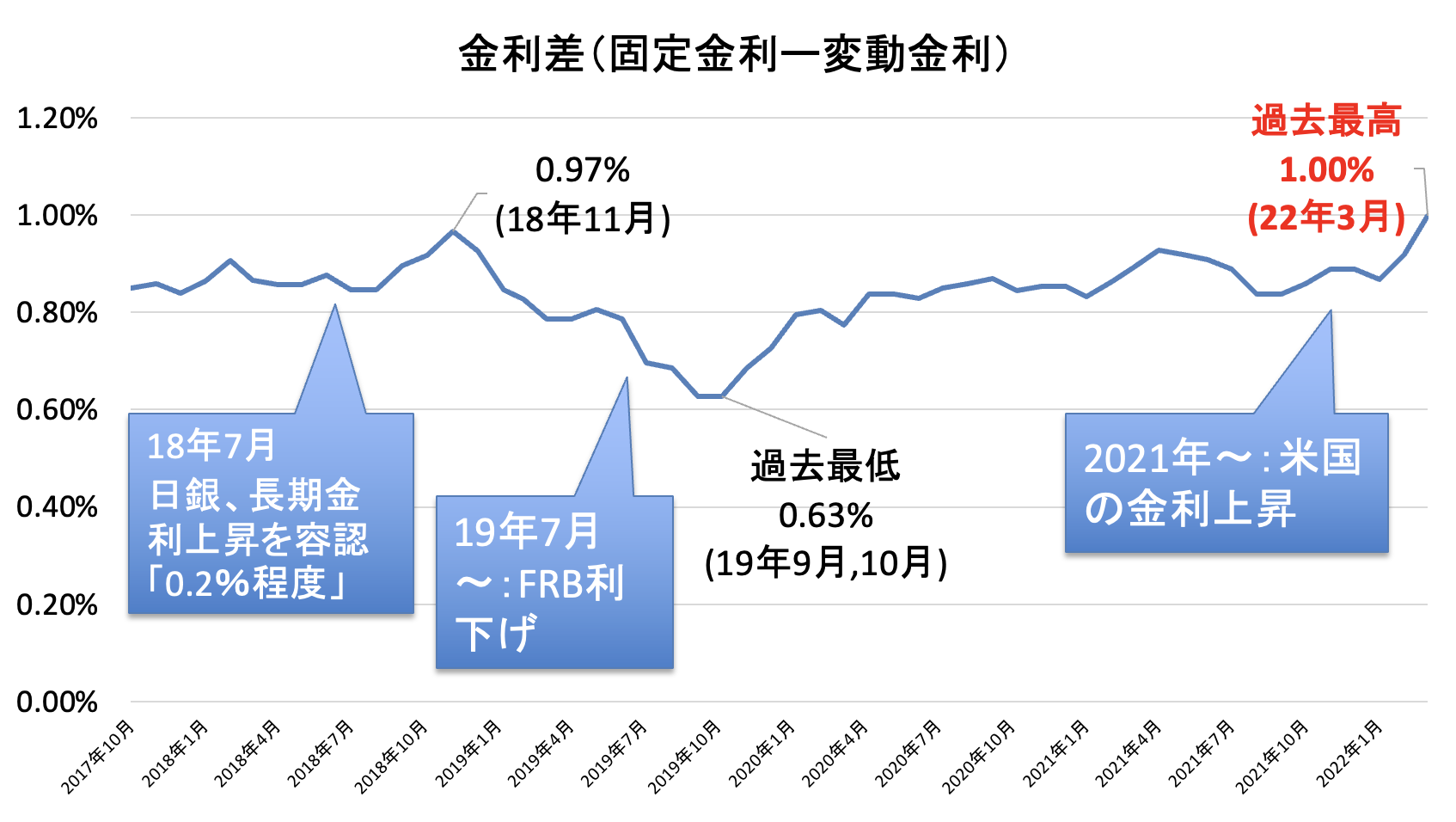 アメリカの利上げを受けて、日本の住宅ローンの固定金利が上昇しています。一方で、変動金利は低いまま推移しているため、固定金利と変動金利の金利差は過去最大の1%となりました。