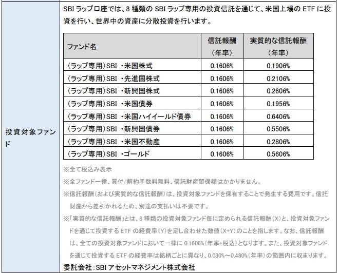 ※「実質的な信託報酬」とは、8種類の投資対象ファンド毎に定められる信託報酬(X)と、投資対象ファンドを通じて投資するETFの経費率(Y)を足し合わせた数値(X+Y)のことを指します。なお、信託報酬は、全ての投資対象ファンドにおいて一律に0.1606%(年率・税込)となります。また、投資対象ファンドを通じて投資するETFの経費率は銘柄毎に異なり、0.030%~0.480%(年率)の範囲に収まります。「実質的な信託報酬の合計額」については、8種類の投資対象ファンドの組み入れ状況によって異なりますが、最新の運用戦略を用いて運用を行った場合、その合計額は0.220%~0.394%(年率・税込)の範囲内に収まります。「実質的な信託報酬の合計額」の平均値については、2012/1/4~2021/12/30までSBIラップで運用を行ったと仮定したバックテストによって示された平均投資配分比率を基に算出したもので、その値は0.295%(年率・税込、小数点第4位切上げ)となりますが、実際の運用においては、この数値を上回る場合があります。