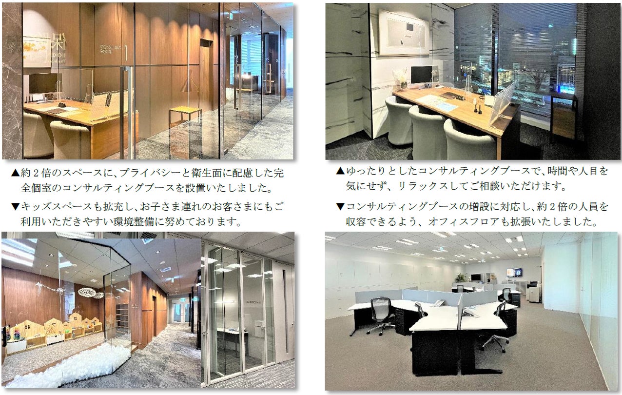 ・ 倍増したスペースを活用し、プライバシーと衛生面に配慮した完全個室のコンサルティングブースを設置いたしました。急増するお客さまに対応し、コンサルティングブースの質を高めながらブース数を増設することで、より多くのお客さまにご利用いただける体制を構築しております。