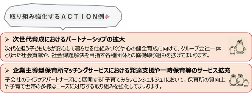 近年、核家族化の進行や女性の社会進出等を背景に子育てを取り巻く環境は大きく変化する中、子育ての壁や不安を当事者だけに留めるのではなく、次世代に向けて社会全体で考えるべき問題として捉え、“みんなで子どもを育てる社会”の実現に向け、さまざまな情報発信(Think)や商品・サービスの提供および次世代育成のさらなる強化(Action)を通じ、より多くの方を応援してまいります。