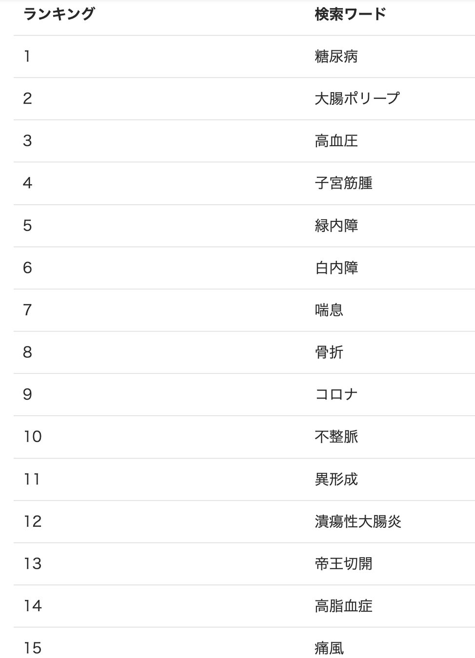 「今回もソリシター君上でユーザーが検索している病名の検索ランキングベスト15を発表させて頂きました。