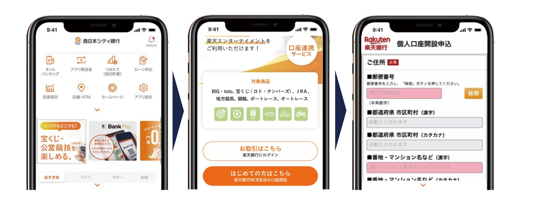 西日本シティ銀行のお客さまは、「西日本シティ銀行アプリ」の楽天銀行のエンターテイメントサービスのバナーから、楽天銀行専用支店(NCB支店)の口座を開設し、本サービスを 申し込むことができます。