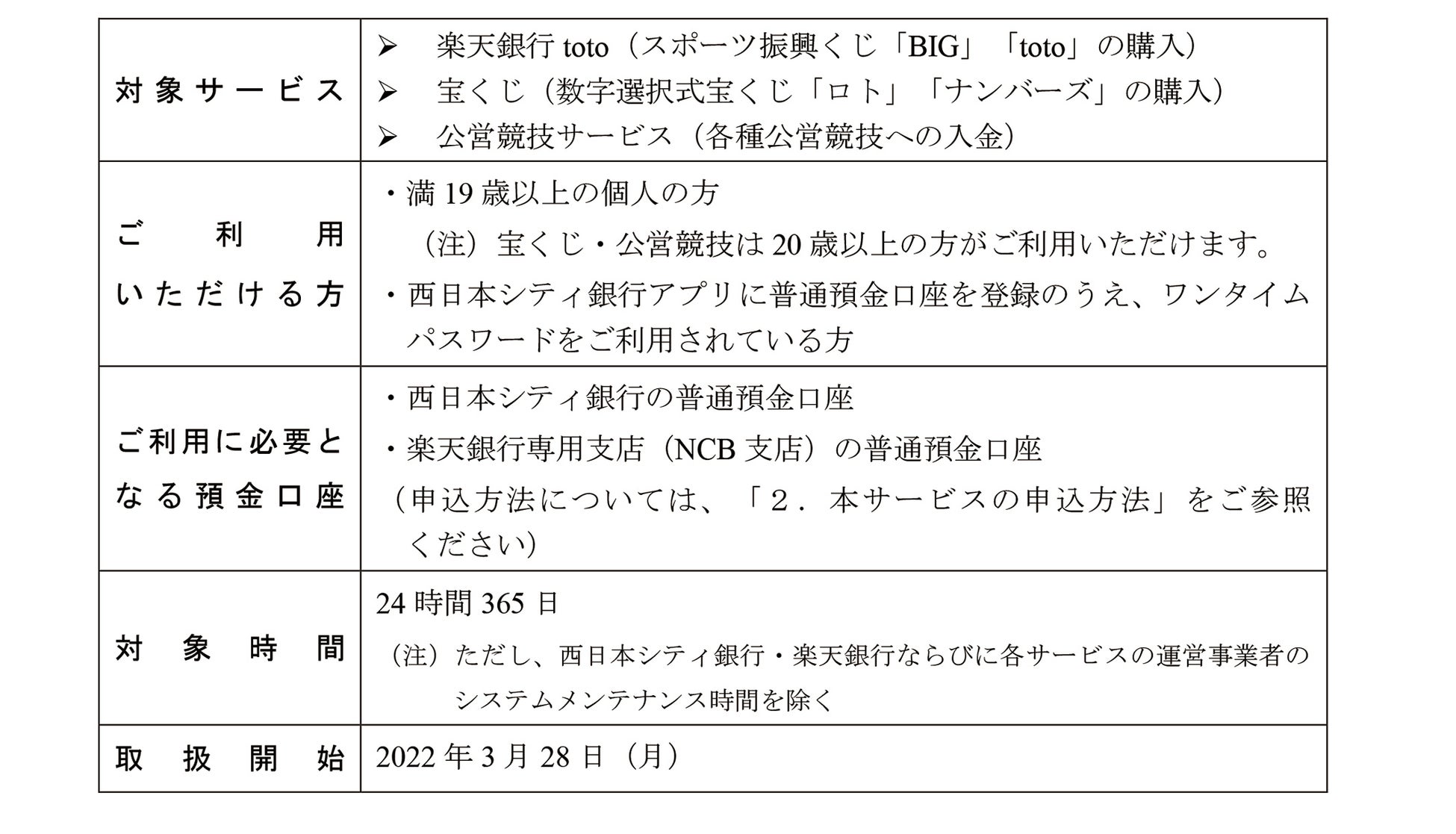 株式会社西日本シティ銀行(頭取 村上 英之、以下「西日本シティ銀行」)と楽天銀行株式会社(代表取締役社長 永井 啓之、以下「楽天銀行」)は協働し、楽天銀行のエンターテイメントサービス※の利用代金を即時決済する「口座連携サービス」(以下「本サービス」)の取扱いを開始しますので、お知らせします。