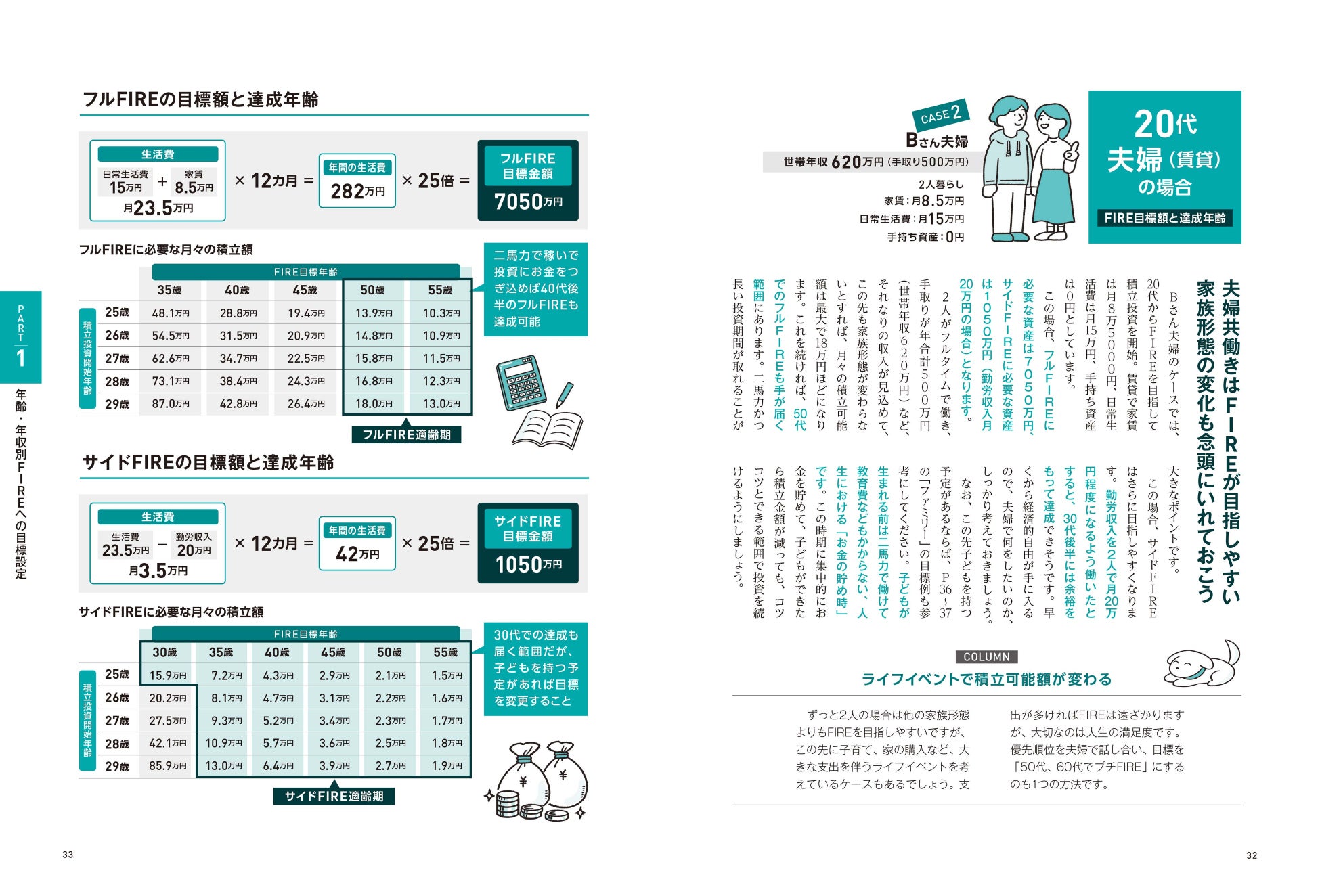 20代〜50代の家族構成別にFIRE目標額、FIRE達成額を掲載。さらに、そのために必要な毎月の投資額も表にして掲載したり、FIREを目指す上での注意点・アドバイスを世代別に紹介しているので、具体的なFIREへの道筋がしっかりイメージできます。