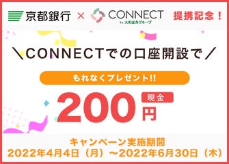 提携開始を記念して、期間限定で京都銀行ホームページや京銀アプリからCONNECTの証券口座の開設をした方に現金200円をプレゼントするキャンペーンを行います。