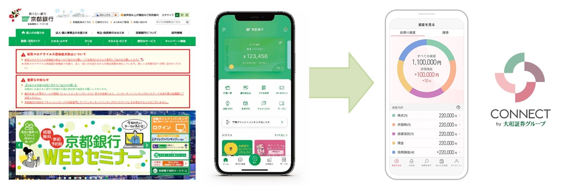 本契約に基づき、2022年4月4日(月)以降、京都銀行のホームページや京銀アプリからCONNECTの金融商品仲介口座を開設し、株式・投資信託など様々な金融商品がオンラインでお取引いただけるようになります。