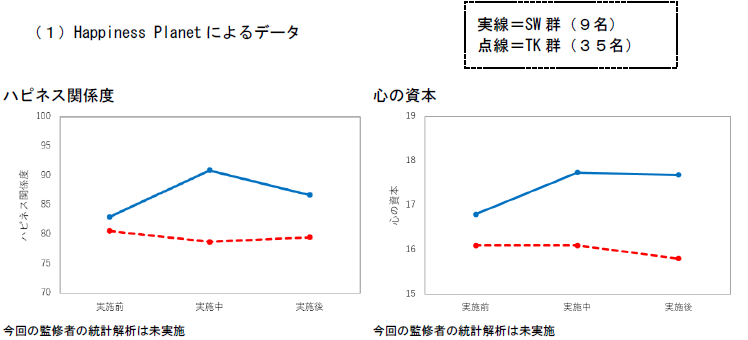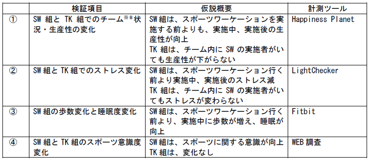スポーツワーケーション実施組9名※6(約3週間のうち、6日間スポーツワーケーション実施、以下「SW組」)と通常勤務組35名(約3週間通常勤務、以下「TK組」)に分かれ、Happiness Planet、LightChecker、Fitbit、WEB調査※7により参加者の各種データを取得し、効果を検証した。