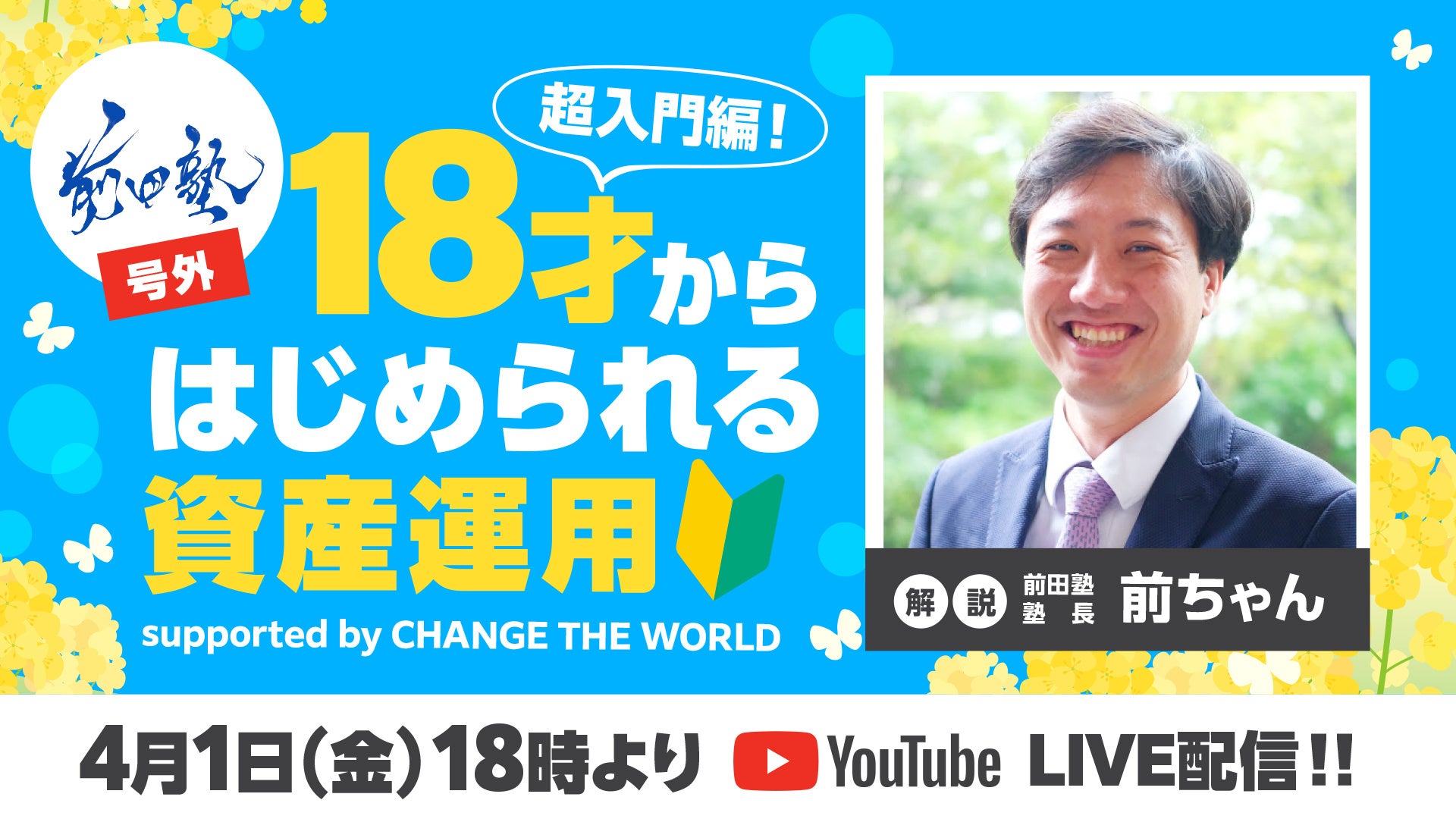 株式会社チェンジ・ザ・ワールド(本社:⼭形県酒⽥市 代表取締役:池⽥友喜)は、株式会社レゾナンス(本社:東京都中央区 代表取締役:前田恵一)と合同で、4月より新成人となる18才以上の若者が知りたい投資に関する基礎知識をゼロから学べる番組「前田塾号外 18才からはじめられる資産運⽤-超⼊⾨編-」を4⽉1⽇(⾦)18:00より、YouTubeでLive配信することを決定いたしました。