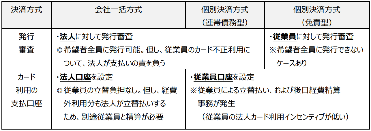 ご好評いただいている法人カードですが、そのお支払い(決済)には、会社一括方式、個別決済方式(連帯債務型)、個別決済方式(免責型)の3種類の方式(※1)があります。