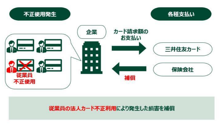 三井住友カードが発行する法人カード(コーポレートカード(※2)、パーチェシングカード)会員向けの、オプション型(任意加入)の保険プログラムです。万一、従業員が法人カードを不正利用し、本人からの回収が困難になるようなケースが発生した場合に、会社が被る金銭的な損害を補償します。