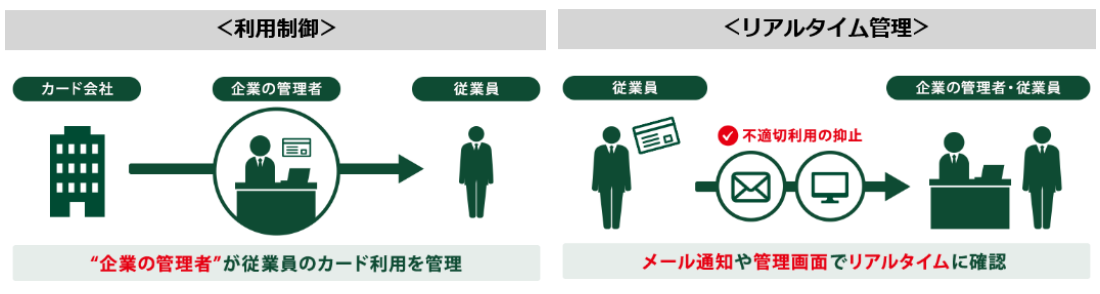 ・管理者側で従業員のコーポレートカード利用をリアルタイムに管理し、設定ルールを逸脱する場合はアラートメールで通知、またはカード利用を制御するサービス