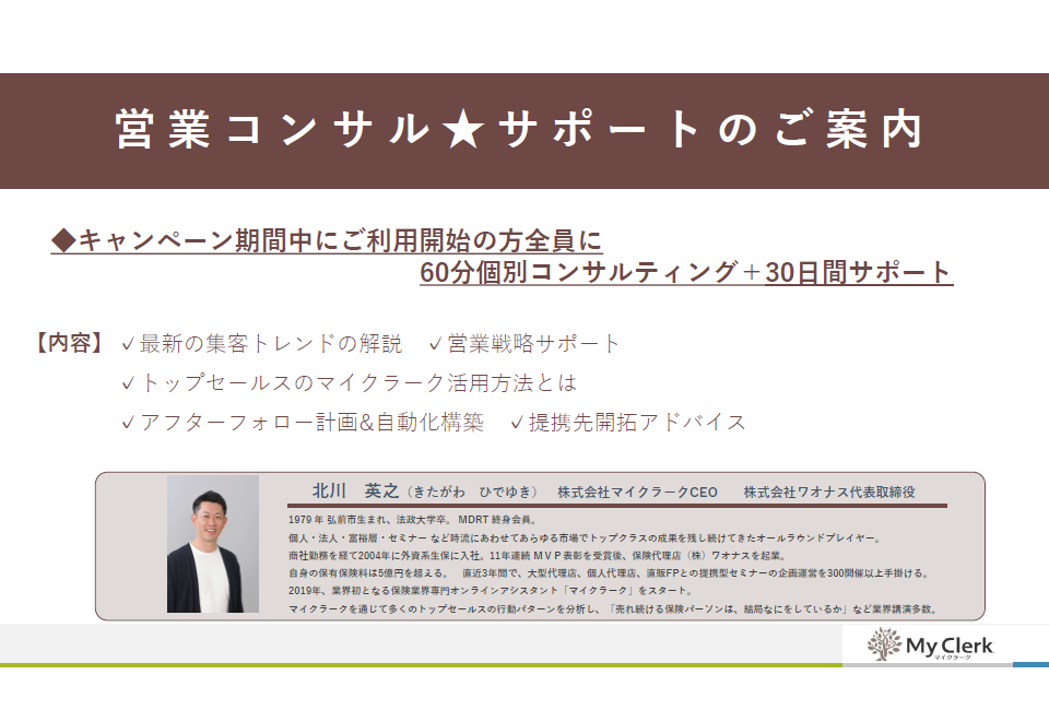 最新の集客トレンド解説や、営業戦略、トップセールスのマイクラーク活用法など、多くのトップセールスの行動パターンを分析してきた経験を基に、CEOの北川が直接コンサルティングを行います。