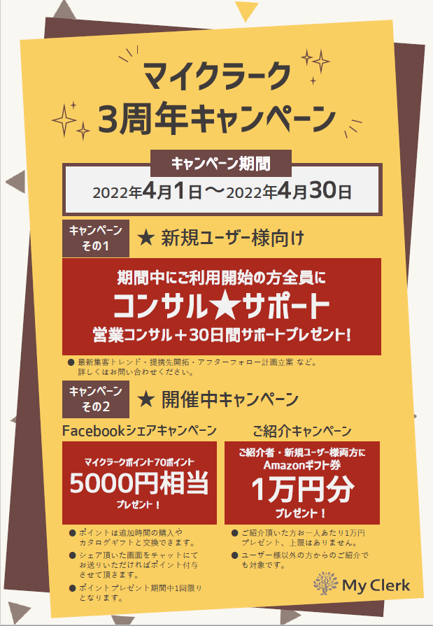 保険業界をDXする仙台市発のスタートアップ、株式会社マイクラーク(仙台市 代表取締役北川英之)は、3周年キャンペーンとして新規ユーザー向けに「営業コンサル+30日間サポート」を提供する「3周年キャンペーン」を4月1日(金)から開始いたします。