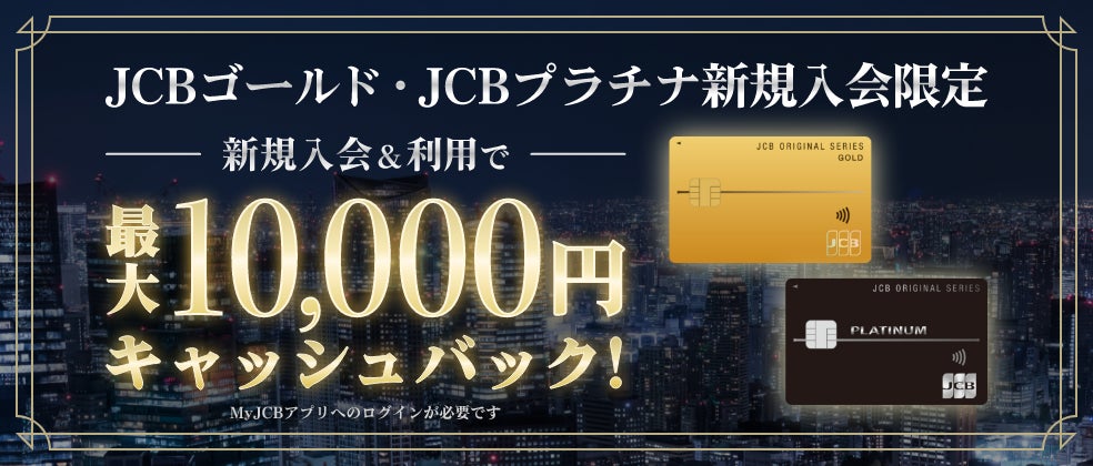 本キャンペーン実施中にJCBゴールド・JCBプラチナに新規入会後、My JCBアプリにログインいただき、条件金額以上をご利用いただくと、最大10,000円キャッシュバックされます。