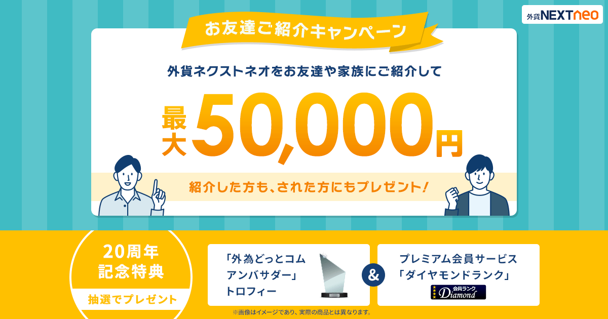 お客様の紹介したお友達がすべての条件を満たされた場合、お客様とお友達にもれなく10,000円をプレゼント!また紹介上限5名を達成したお客様抽選で最大5名様へ、外為アンバサダートロフィーを進呈!さらに、CP集計終了から1ヵ月間ダイヤモンドランクを付与します。