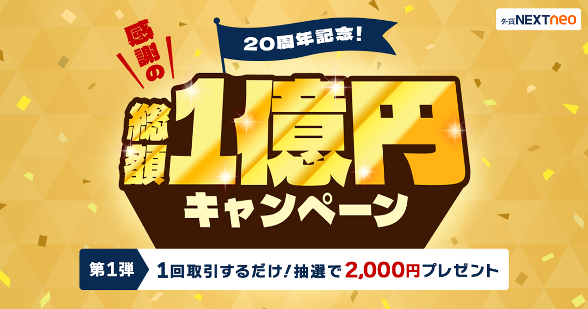 20周年記念イヤーを通し一年間で総額1億円をお客様へ提供するキャンペーンを実施。その第1弾として、「新規取引」を行ったお客様の中から抽選で12,500名様に現金2,000円をプレゼントします。