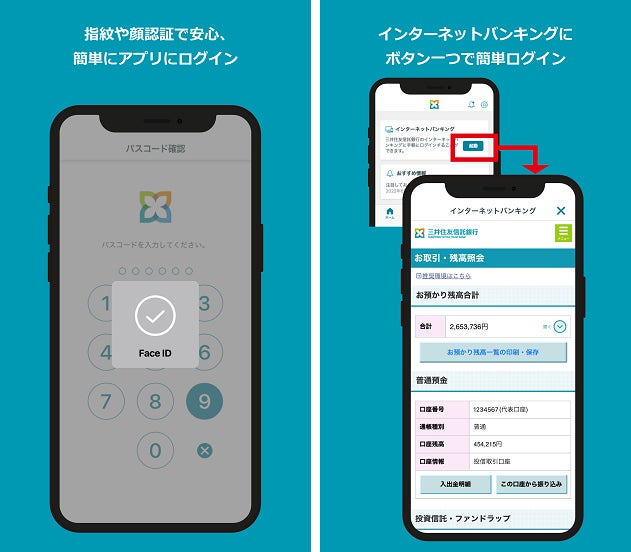 また、スマートフォンの生体認証機能と連携することで、会員番号やパスワードを入力せずにログインできるため、便利に、かつ安心してご利用いただけます。当社のインターネットバンキングにもボタン1つでログインできるため、当アプリで得たお金の課題解決のヒントをもとにそのまま手続きをすることも可能です(※1)。
