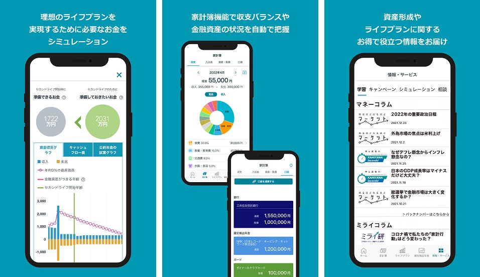 当アプリは、人生100年時代に向けて必要なお金をユーザーとともにデザインし、お金のミライを創るというコンセプトのもと、理想のライフプランの設計や、家計や資産を一括管理する機能から資産形成に関する情報収集サービスなどをまとめて提供するスマートフォンアプリです。