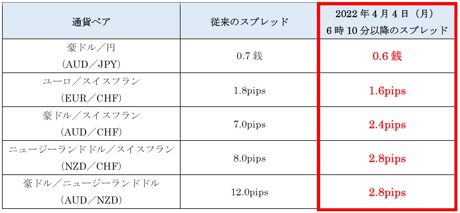 楽天証券株式会社(本社:東京都港区、代表取締役社長:楠 雄治、以下「楽天証券」)は、本日、2022年4月4日(月)取引開始時より、「楽天FX」における「豪ドル/円」をはじめ、5通貨ペアのスプレッドを大幅縮小したことをお知らせします。これにより、主要21通貨ペアの通常スプレッドが、大手ネット証券最狭水準(※)になります。