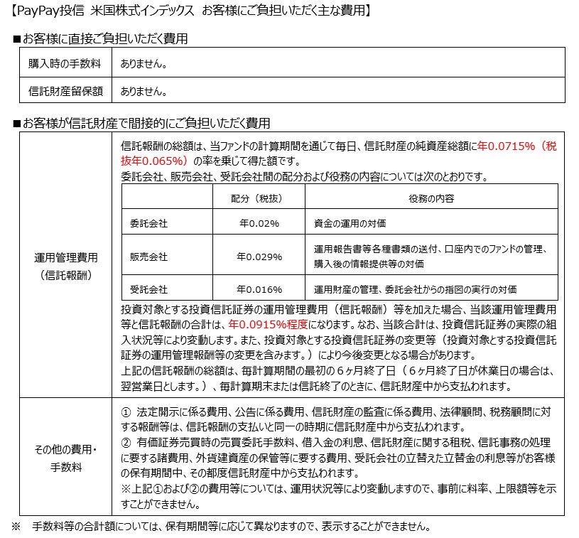 【PayPay投信 米国株式インデックス お客様にご負担いただく主な費用】