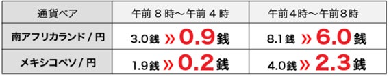 ・強制決済およびロスカット時には片道1通貨あたり、南アフリカランド/円とメキシコペソ/円の場合は0.5銭、その他通貨ペアについては5銭が手数料としてかかります。